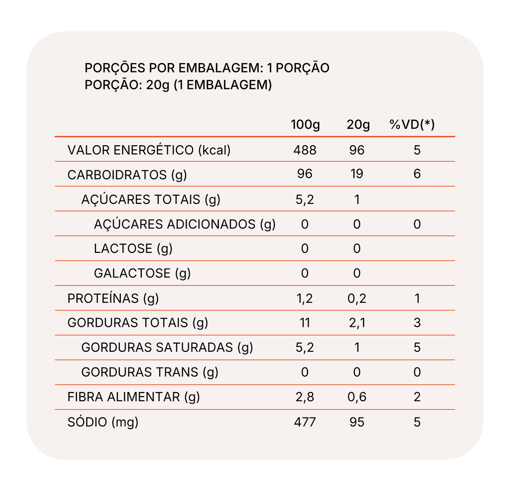 Nossos biscoitos têm baixo teor de sódio. Por exemplo, o biscoito de beterraba (20g) contém apenas 96mg de sódio. Já o de couve e espinafre não tem adição de sódio.