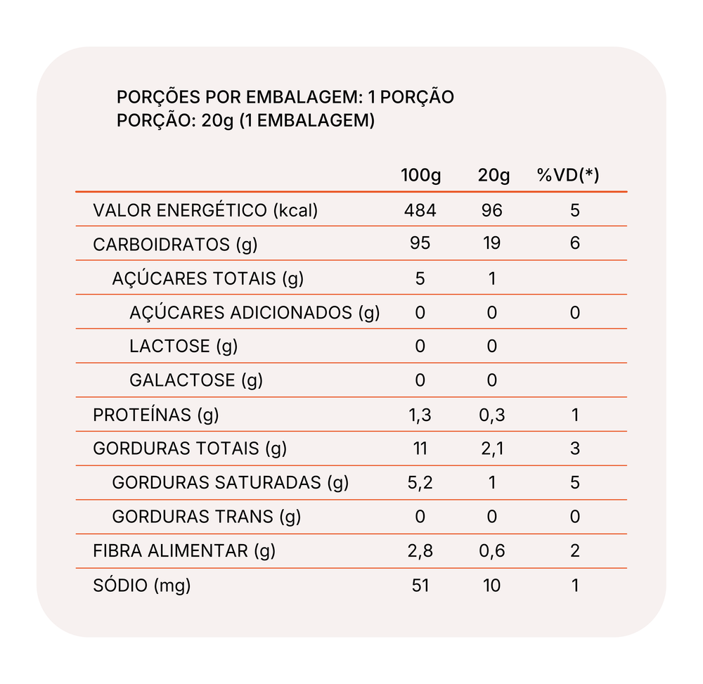 Usamos gordura vegetal de palma, um ingrediente natural, sem gordura trans e rico em vitaminas A e E, respeitando os limites recomendados para a saúde.