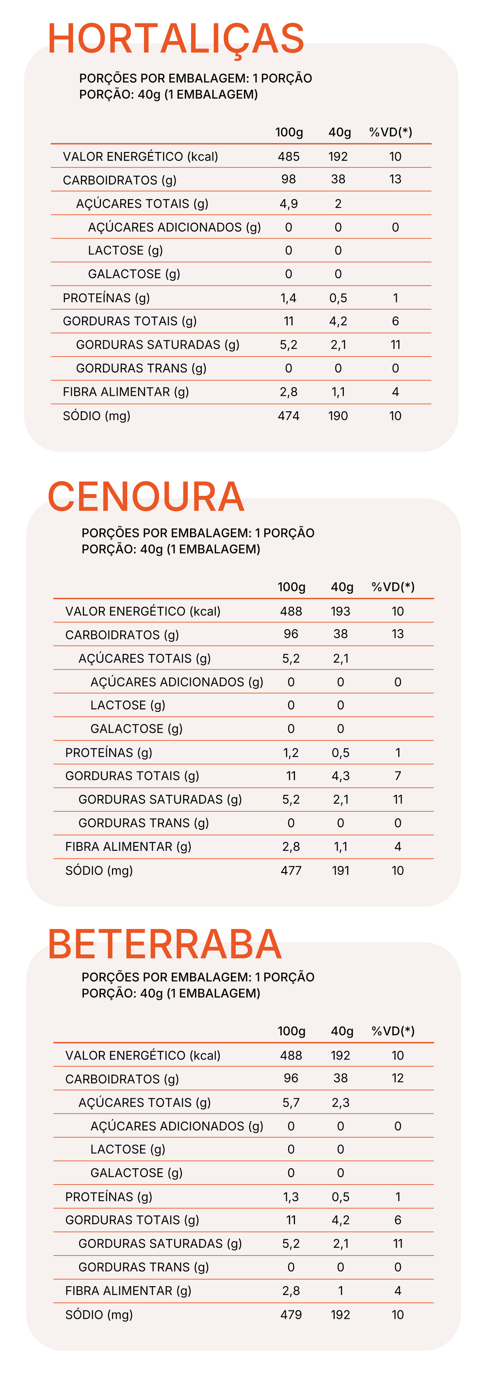 Hortaliças Polvilho azedo, batata doce in natura, gordura de palma, espinafre in natura, sal, alecrim in natura, salsa in natura, manjericão in natura. NÃO CONTÉM GLÚTEN