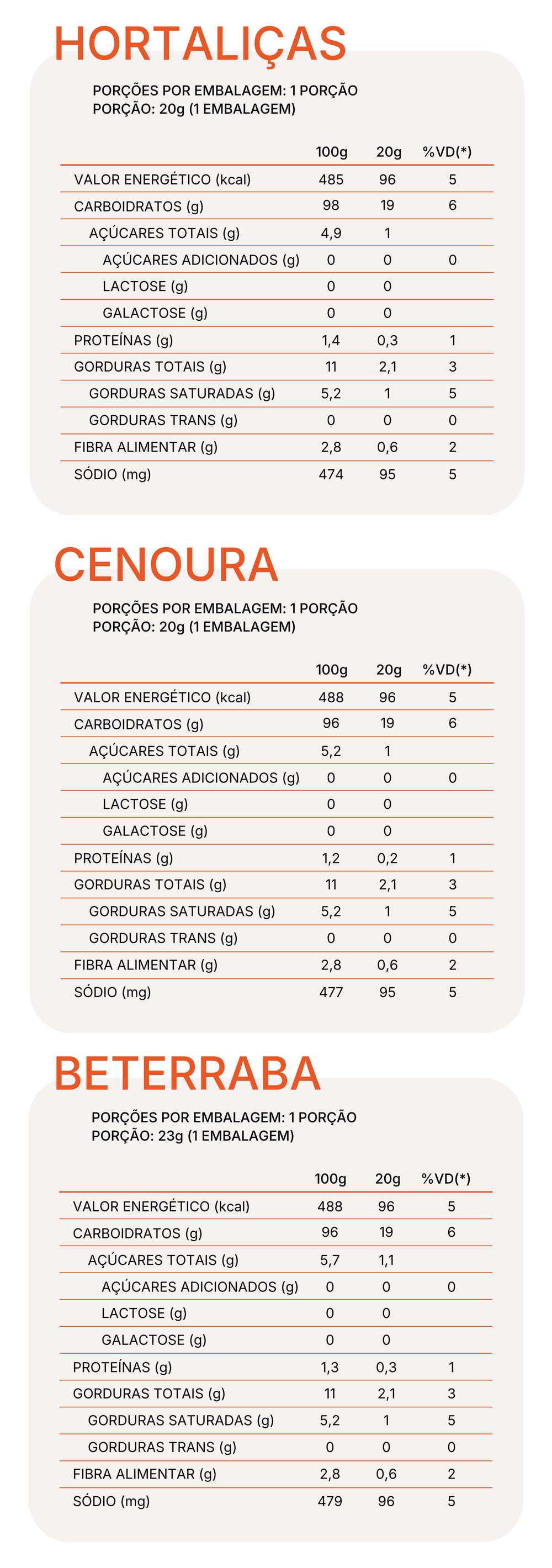 BETERRABA: Polvilho azedo, batata doce in natura, gordura de palma, beterraba in natura, sal e salsa in natura. NÃO CONTÉM GLÚTEN.