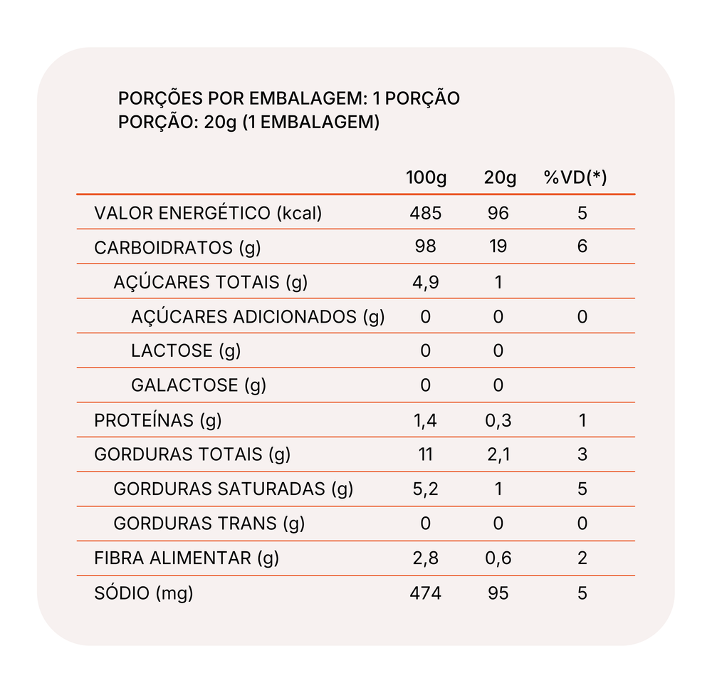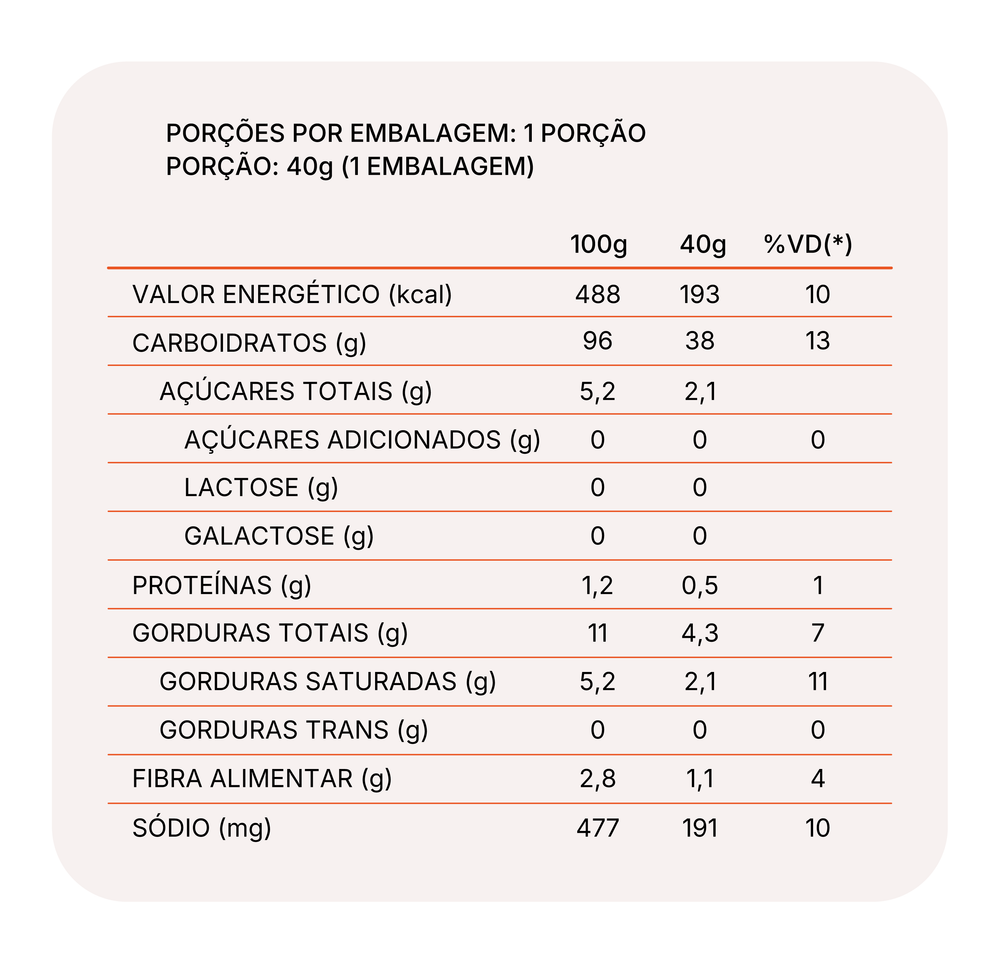 CENOURA E CÚRCUMA : Polvilho azedo, batata doce in natura, gordura de palma, cenoura in natura, cúrcuma in natura e sal. NÃO CONTÉM GLÚTEN.