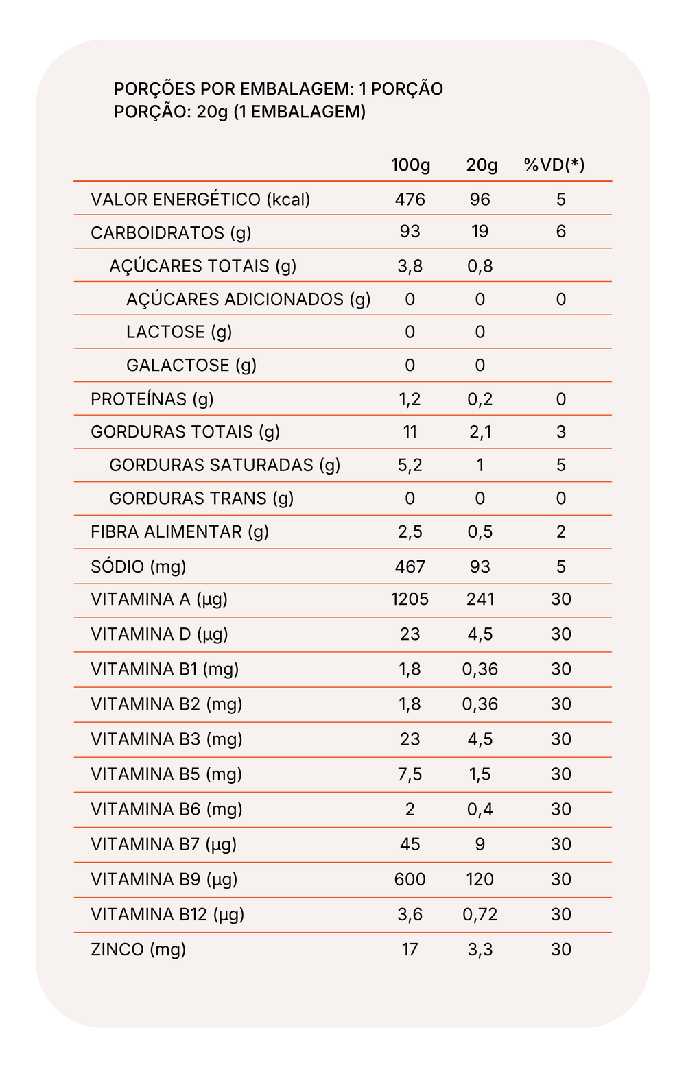 SOPINHA DE LEGUMES:  Polvilho azedo, batata doce in natura, abobrinha in natura, gordura de palma, cenoura in natura, tomate in natura, cebola in natura, alho poró in natura, sal, louro, mix de vitaminas (vitamina A (acetato de retinol), vitamina D (ergocalciferol), vitamina B1(tiamina), vitamina B2 (riboflavina), vitamina B3 (niacina), vitamina B5 (ácido pantotênico), vitamina B6 (piridoxina), vitamina B7 (biotina), vitamina B9 (ácido fólico),  Vitamina B12 (cianocobalamina) e Mineral (Zinco (sulfato de zinco). NÃO CONTÉM GLÚTEN.