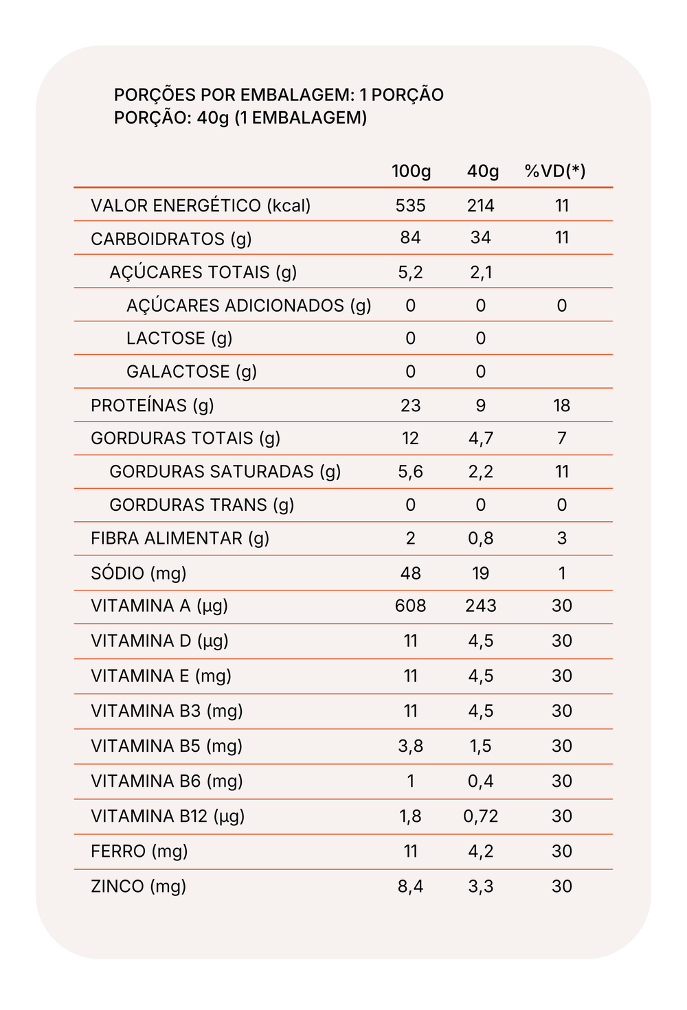Enriquecido com vitaminas A, D, E, B3, B5, B6, B12 e minerais Zinco e Ferro
